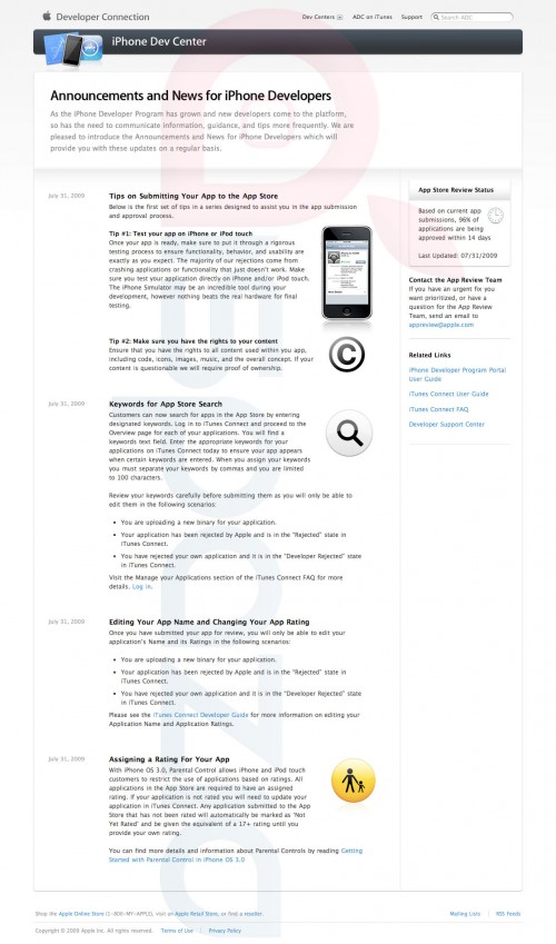 A causa del rapido incremento di iscritti all’iPhone Developer Program, Apple, ieri notte, ha introdotto una nuova sezione chiamata “Announcements and News for iPhone Developers“, tramite la quale verranno postate notizie e Tips molto utili per essere indicizzati, per evitare di essere rifiutati ed altro ancora.