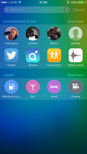 13. Sulla SpringBoard possiamo notare la lente d’ingrandimento prima dei puntini delle varie pagine. Spostandoci in questa sezione, entreremo nel vivo di Proactive ed i suggerimenti di Siri che miglioreranno sempre di più in base alle nostre abitudini.