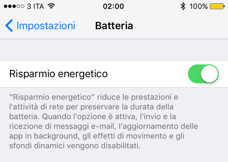 7. In Impostazioni > Batteria, oltre ad abilitare la percentuale, potremo attivare la modalità di risparmio energetico. Quest’ultima, riduce le prestazioni e l’attività di rete per preservare la durata della batteria. Quando l’opzione è attiva, l’invio e la ricezione di messsaggi email, l’aggiornamento delle app in background, gli effetti di movimento e gli sfondi dinamici vengono disabiltiati. L’icona della batteria viene colorata di arancione.
