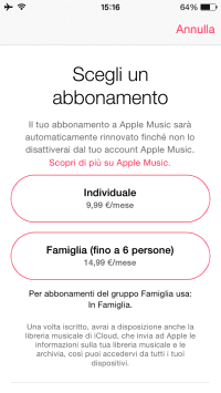 Una volta creato il gruppo, vi basterà aprire Apple Music, andare sulla sezione Per Te e cliccare Iscriviti ad Apple Music. Alla fine scegliete l’abbonamento Famiglia ed una volta effettuato il pagamento, ogni membro della famiglia potrà usufruire del servizio di musica in streaming Apple.