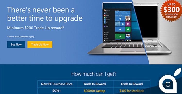 Secondo quanto esposto da Microsoft, gli utenti potranno usufruire di quella che è stata chiamata Easy Trade Up per l’acquisto di PC Windows 10 per un costo pari o superiore ai 599$. Requisiti per ricevere uno sconto fino a 300$ è quello di dare in permuta macchine Windows all-in-ones, laptops, così come MacBook e iMac non più vecchi di sei anni.