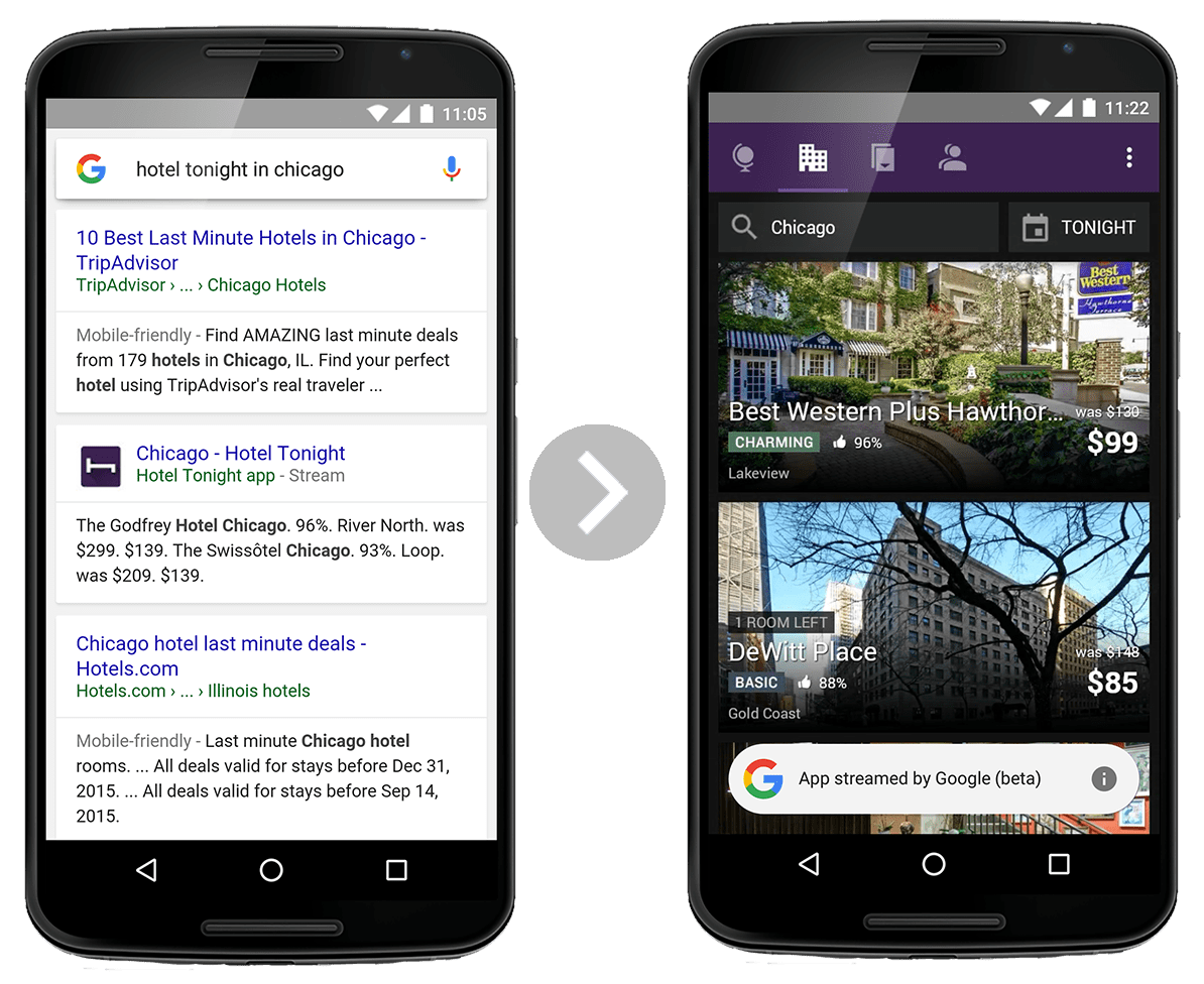 Per facilitare la ricerca e la consultazione di contenuti disponibili nelle applicazioni, Google ha presentato una tecnologia di ‘app streaming’. In pratica, se viene visualizzato il contenuto proveniente da un’app che non è installata sul dispositivo, Google permetterà comunque di consultarlo tramite un apposito pulsante “Stream”.