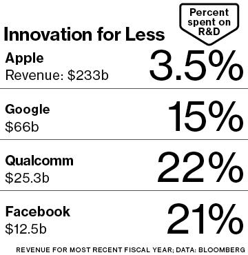 Apple è l’azienda che ha speso meno in ricerca e sviluppo rispetto agli altri colossi come Facebook, Google, Qualcomm e così via. Tuttavia Apple è l’azienda che ottiene più risultati e già nel 1988 Steve Jobs spiegava che l’innovazione non ha niente a che vedere con la quantità di dollari che vengono spesi in ricerca e sviluppo ma dipende soltanto dalle grandi menti di cui ci si circonda.