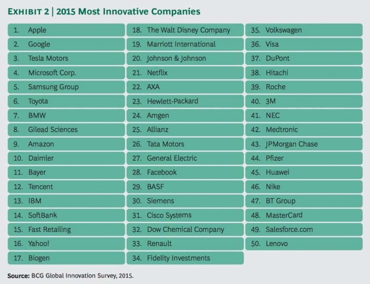 Nelle classifiche redatte dalla Boston Consulting, Apple difende agguerritamente il titolo di azienda più innovativa dell’anno. Sugli altri gradini del podio figurano aziende come Google e Tesla motor. In questa classifica sono raggruppate le 50 aziende più innovative con sede in America, Essa è determinata in parte da interviste ad un campione di 1.500 dirigenti di tutto il mondo a cui viene chiesto quale azienda nel proprio settore considerano la più innovativa. Va da se che la possibilità di votare per la propria azienda non è contemplata. L’altro elemento preso in considerazione per stilare la classifica è la quantità di denaro investito che viene restituito agli azionisti nell’arco di cinque anni.