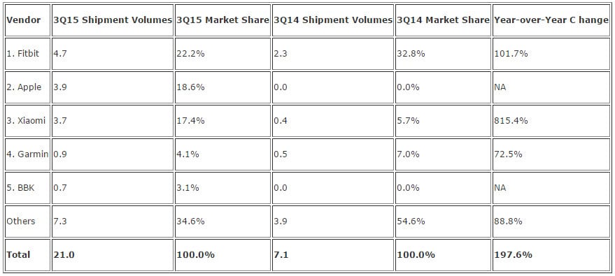 A seguito di un primo periodo decisamente non positivo, il mercato dei dispositivi indossabili sta iniziando finalmente a prendere quota. Se si considerano le 21 milioni di unità di questo trimestre, rispetto alle 7,1 milioni nel terzo quadrimestre del 2014, gli indossabili vedono una crescita del 197,6%. Sul podio di questa crescita vediamo FitBit, Apple ma non Samsung.