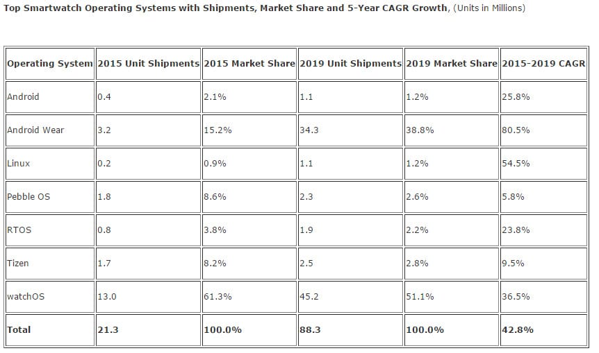 Gran parte del merito sarà da dare ad Apple Watch all’instancabile schiera di appassionati di prodotti Apple, mentre non si prevedono momenti rosei per Pebble che perderà quote di mercato a favore di Android Wear e watchOS.