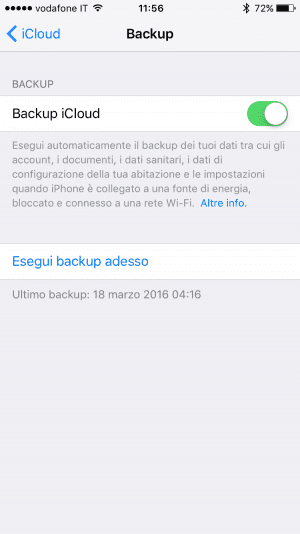 Se avete impostato il backup automatico su iCloud non dovrete far nulla: il vostro dispositivo ne eseguirà uno nuovo ogni qualvolta sarete connessi ad una rete Wifi e, contemporaneamente, sarà collegato anche alla presa elettrica. Per controllare se il backup è impostato su iCloud basterà controllare in Impostazioni > iCloud > Backup
