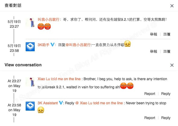 3K Assistant, socio di TaiG ha lasciato intendere che probabilmente stanno ancora lavorando su un possibile jailbreak, dall’immagine qui di seguito, possiamo vedere che 3K ha risposto alle domande di un utente su un post inerente il jailbreak di iOS 9.2.1. La loro risposta è stata molto interessante; ” non abbiamo mai smesso”.