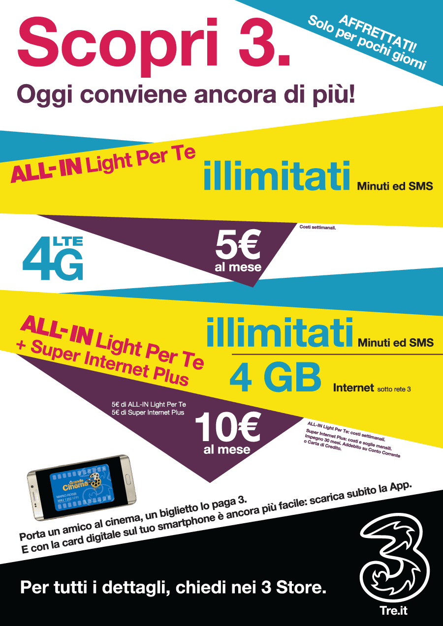 A queste tariffe descritte, chi vorrà vincolarsi a Tre per 30 mesi, potrà ottenere 1GB di traffico dati in più, sulla ALL-IN 400 per te 7GB e sulla ALL-IN Light per te 3GB