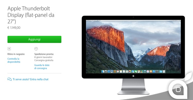 Sembrerebbe che l’ormai vecchio display Apple non sia più disponibile in diversi store nel Nord America e in Europa. Attualmente infatti, è possibile acquistare il dispositivo solamente in un Apple Store, oppure prenotare l’acquisto online e ritirarlo nello store più vicino. E’ probabile che presento vedremo un monitor completamente rivisitato e dotato di un pannello 4K o addirittura 5K, proprio come sui recenti iMac da 21″ e 27″. Il nuovo Thunderbolt Display potrebbe essere presentato durante la WWDC 2016, che si terrà proprio tra qualche giorno.