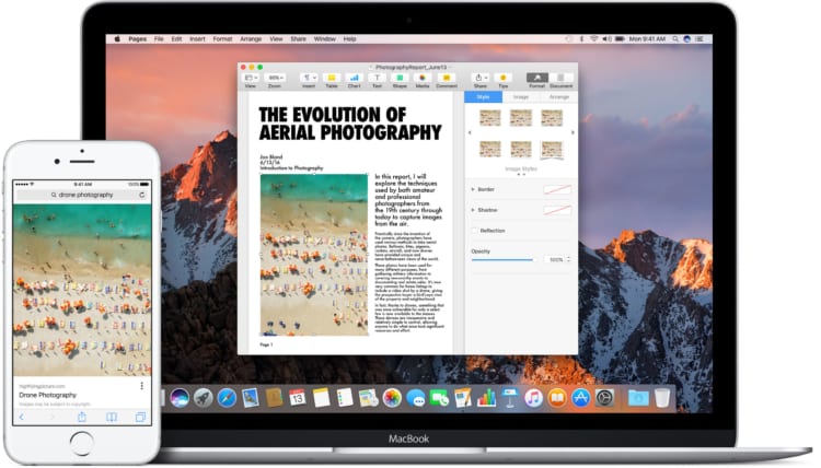 Le funzioni Continuity fra i dispositivi Apple sono state perfezionate in macOS Sierra. Grazie alla Universal Clipboard, i contenuti degli appunti sono disponibili su tutti i dispositivi Apple via iCloud. Si possono facilmente copiare e incollare testi, immagini, foto e video fra Mac e iPhone e iPad.