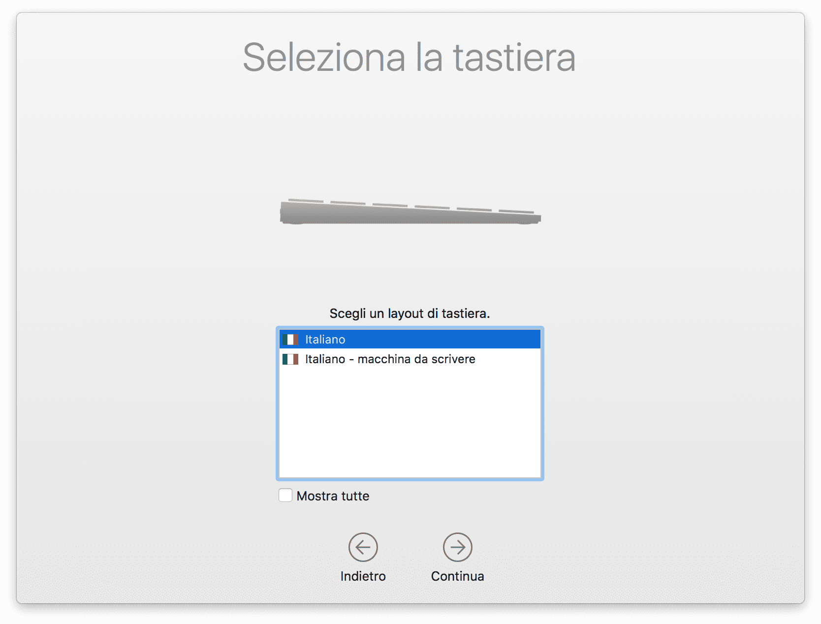 1. Nuova immagine nella prima fase dell’installazione dove viene richiesta la lingua della tastiera il simbolo di quest’ultima rispecchia la Magic Keyboard di profilo.