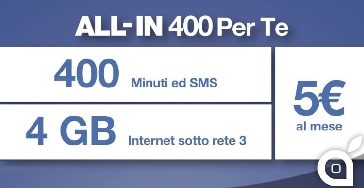 L’offerta della Tre è attivabile ancora per pochi giorni da chiunque voglia effettuare la portabilità da un altro operatore a Tre e comprende 400 minuti ed SMS con 4GB di internet a 5€ al mese. Ovviamente il tutto sarà dilazionato con 100 minuti/sms ed 1GB di traffico ogni settimana.