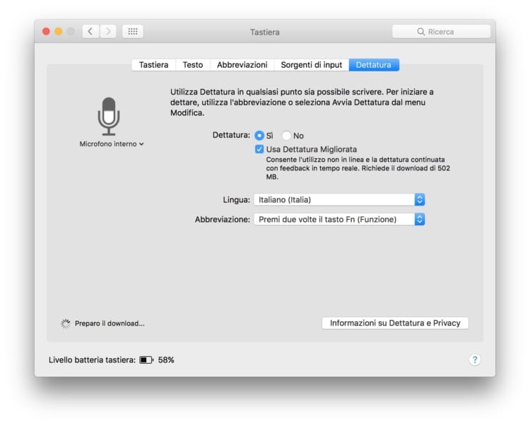 2. Scorrete l’elenco sulla sinistra fino a trovare “Dettatura” ed abilitatela