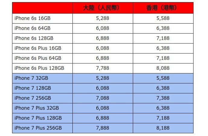 Stando a quanto emerso nelle ultime ore da un sito cinese, i prezzi degli iPhone 7 saranno molto simili a quelli degli attuali iPhone 6s, ma c’è una sostanziale novità: i nuovi tagli di memoria. Come potete vedere dalla tabella sottostante, i nuovi iPhone 7 verranno venduti allo stesso prezzo del medesimo modello dell’iPhone 6s, ma avranno una memoria interna raddoppiata. Ebbene sì, secondo la fonte non ci saranno più gli iPhone da 16 GB, ma avremo come modello entry-level uno da 32 GB, sia per il modello normale che per quello Plus. Allo stesso modo il modello da 64 GB verrà sostituito con quello da 128 GB ed infine quello da 128 GB con quello da 256 GB. Come già detto in precedenza, i prezzi però dovrebbero rimanere invariati.