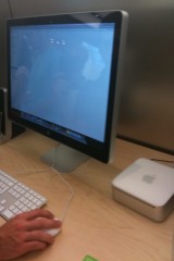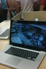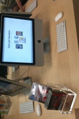 Nel negozio, sulla sinistra ci sono i Mac appoggiati ai tavolini. E’ qui che si tengono anche le sessioni one to one dove gli esperti insegneranno ad utilizzare un prodotto o un sofware. In fondo c’è il grande Genius Bar, ovvero una grossa scrivania con 10-12 “geni”.