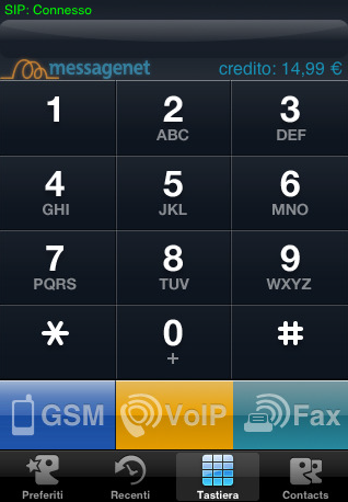 Per utilizzare l’applicazione è sufficiente lanciarla ed inserire le proprie credenziali SIP di Messagente, ovvero il codice URI e la password. A questo punto si aprirà un’interfaccia molto semplice che mostra il tastierino telefonico.
