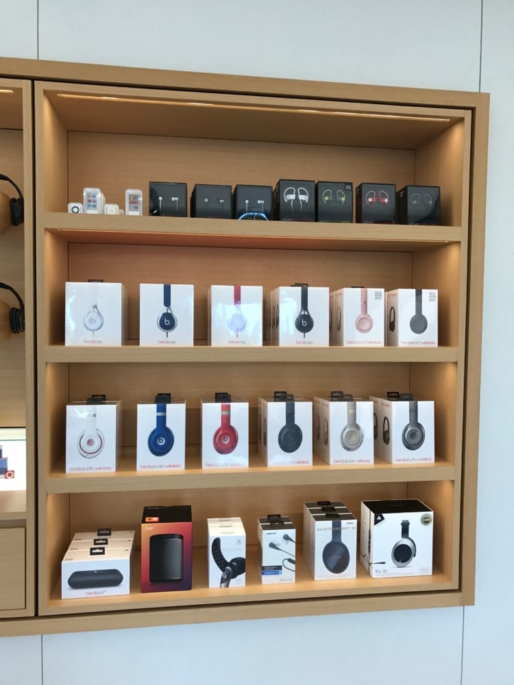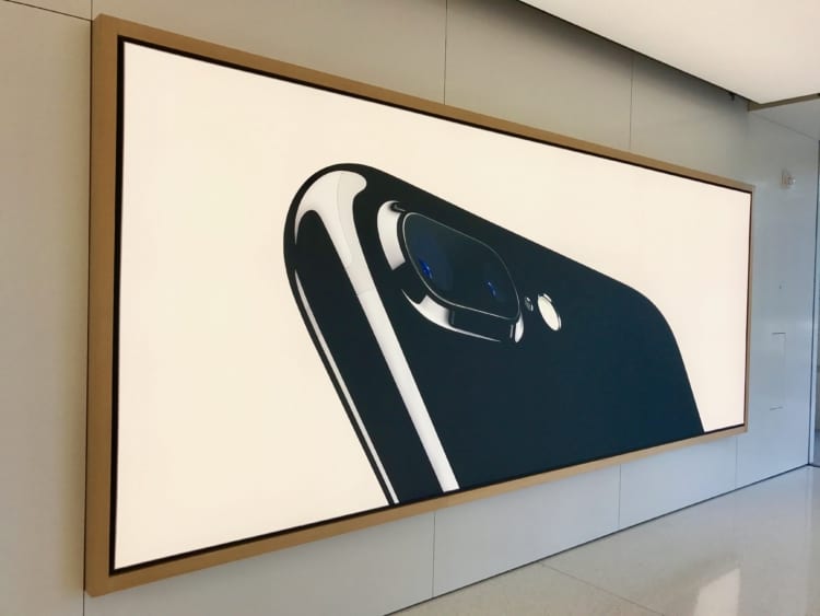 Il design è identico ad altri Apple Store con hardware e accessori esposti. Un display gigante mostra l’ultimo prodotto promozionale, in questo caso il nuovissimo iPhone 7 Plus.