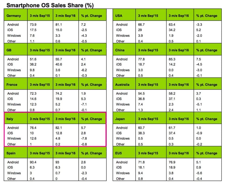Dall’ultimo Report di Kantar Worldpanel, possiamo vedere che l’iPhone 7 sta facendo bene ad Apple, facendo aumentare le quote di iOS del 2,8%. Sale anche Android, del 5,7%, mentre a farne le spese è Windows Phone.