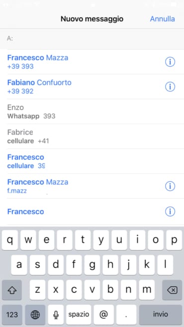 7. Anche se non vedrete apparire quello che scrivete, in realtà lo state facendo e quindi se digitate la “F” vedrete un elenco di tutti i nomi in rubrica salvati con la F e così via. Accanto ad alcuni nomi comparirà un (i)
