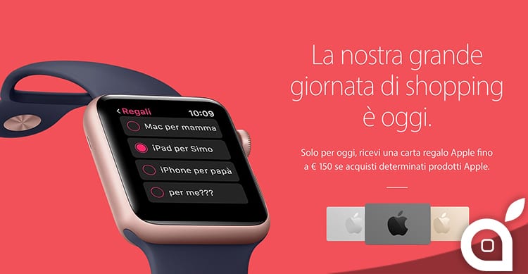- Ed infine Apple regalerà una Gift Card da 150€ a chi acquisterà un MacBook, un iMac oppure un Mac Pro (sono esclusi i modelli più recenti)
