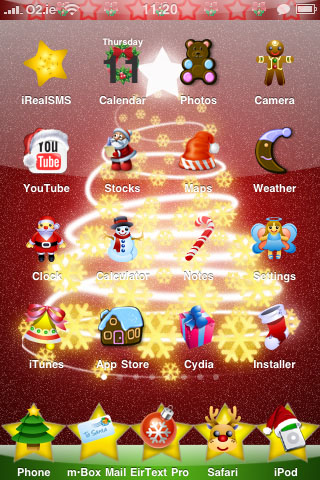 I primi due screenshot rappresentano la Lockscreen e la SpringBoard di un tema chiamato iStorm Xmas e che rendono l’iPhone più simile al BlackBerry Storm in versione natalizia. Il terzo tema invece si chiama Ryan Cawns Christmas.