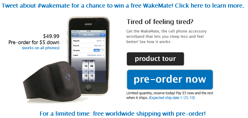 WakeMate è un accessorio che, secondo quanto affermato dagli sviluppatori, permette di migliorare la qualità del sonno di chi lo utilizza. L’accessorio, che consiste in un polsino (actigraph) con un sensore, va indossato prima di andare a dormire: il dispositivo, infatti, raccoglierà, automaticamente, dei dati che saranno inviati all’iPhone e che, grazie al programma apposito, verranno elaborati per scegliere l’ora in cui svegliarsi.