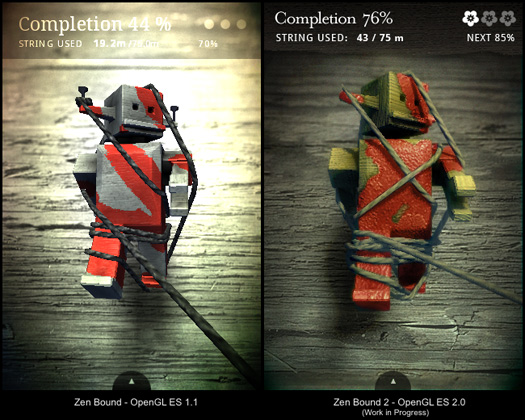 La Exit Secret, società produttrice del gioco Zen Bound, presenta il primo screenshot teaser che ci mostra le migliorie che sono state apportate al prossimo capitolo di questo bellissimo gioco, che è stato progettato utilizzando le librerie ‘Open GL|ES 2.0 che permettono all’iPhone 3GS di sprigionare tutta la sua potenza.
