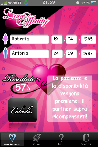 LoveAffinity è un’applicazione, disponibile nell’AppStore, che si prefissa lo scopo di calcolare l’affinità di coppia tra voi e il vostro partner inserendo alcuni semplici dati.