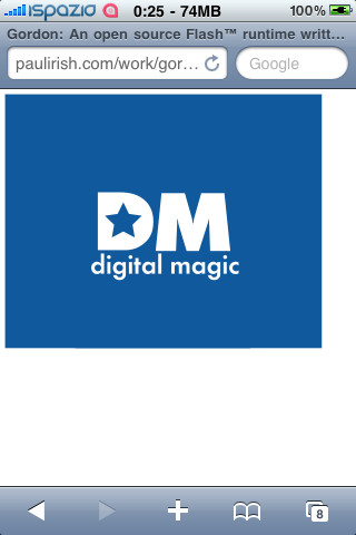 Proprio grazie a questo JavaScript sarà possibile caricare e visualizzare i file .swf all’interno di Safari. Gli sviluppatori non dovranno fare altro che inserire il file flash all’interno di un wrapper HTML collegato al JavaScript del progetto Gordon, come mostrato in questo esempio.