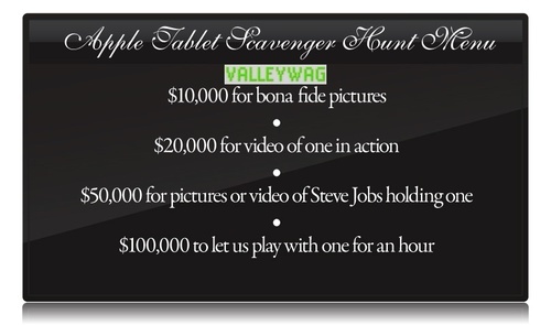 Il nuovo Tablet di casa Apple sta veramente creando un forte scompiglio nel web e si sono delineate due linee di pensiero: coloro che credono nell’uscita di questo nuovo device e coloro che invece pensano si tratti di una bufala. Il Valley Wag, sito gestito da Gawker, aveva quindi lanciato un concorso a premi molto importante, in cui venivano richieste informazioni e dettagli esclusivi sulla tanto acclamata tavoletta.