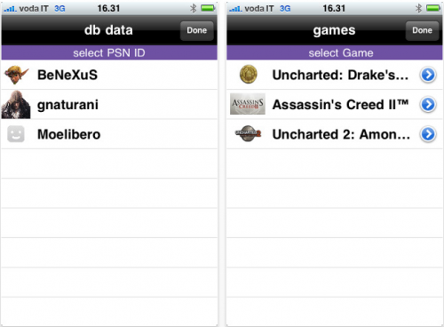 Premendo sul pulsante “games” inoltre, potremo visualizzare la lista dei giochi relativi all’account selezionato. Cliccando sul singolo record avremo accesso ai dettagli del gioco: immagine, trofei vinti. Tutti i dati che vengono recuperati dalla rete vengono salvati in un database interno, al quale è possibile accedere selezionando dalla schermata iniziale il pulsante “db data”. Qui ci troveremo di fronte ad una lista con l’elenco degli account PSN che abbiamo recuperato finora. Selezionando l’account desiderato e premendo “Done” al termine del caricamento potremo tornare a visualizzarne i dati.