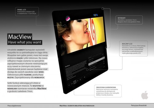 Patrycjusz Brzezinski è l’autore di un bellissimo Concept per il Tablet di Apple. Si chiama MacView ed è composto da una duplice display touchscreen da 10″ ed un sistema a scorrimento che permette di nascondere il secondo sotto l’intera superfice del primo.