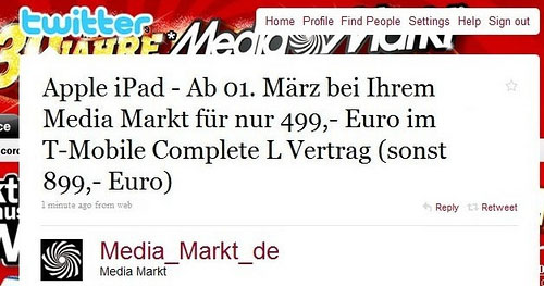 Infine, questa mattina sull’account Twitter del MediaWorld Tedesco, è apparso un messaggio che in seguito è stato subito eliminato. Nel frattempo però ha fatto il giro del mondo e resta solo da capire se è affidabile oppure se si tratta soltanto di una trovata pubblicitaria. Nel messaggio veniva svelato il prezzo del Tablet che corrisponderà a 499€ in abbonamento con un operatore, oppure 899€ senza alcun vincolo e alcun contratto.