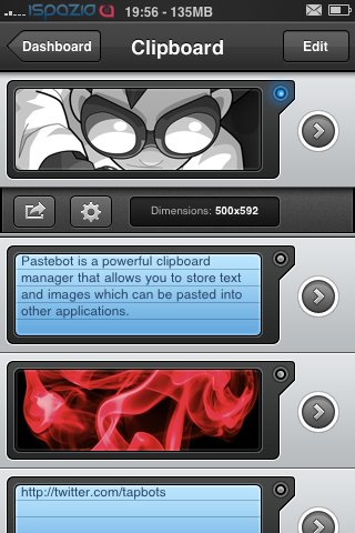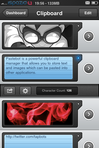 Un Clipboard manager è un applicazione che ti permette di tenere in memoria un certo numero di elementi pronti per essere copiati tra le varie applicazioni. Ci sono numerose utility del genere in AppStore ma la migliore è sicuramente Pastebot. Sviluppata da TapBots, conosciuti per il magnifico convertitore di unità ConvertBot, permette non solo di mantenere in memoria fino a 99 elementi, tra cui immagini e documenti, ma anche di modificarli attraverso numerosi filtri.