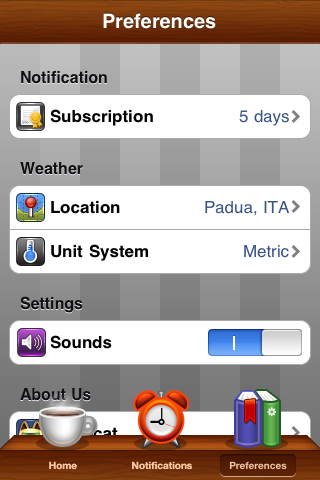- Preferences: le impostazioni; che ci permettono di scegliere la località, l’unità di misura ed effettuare pagamenti per le iscrizioni alle notifiche push tramite l’In-App Purchase. Abbiamo la possibilità di comprare 90 giorni a 0,79€ o 300 giorni a 1,59€.
