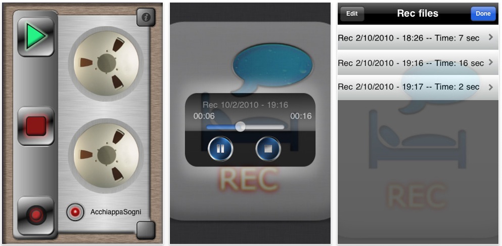 E’ stata rilasciata una nuova applicazione in AppStore chiamata AcchiappaSogni, è sviluppata interamente in Italia e in sostanza ci permette di registrare tutto ciò che accade mentre dormiamo. Ovviamente al mattino non troveremo una registrazione di svariate ore poichè l’applicazione entrerà in azione soltanto quando rileverà dei suoni.