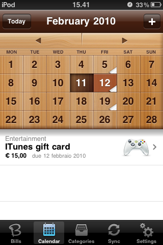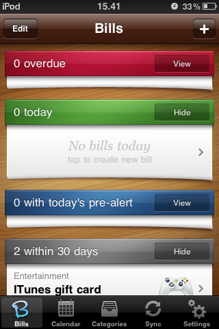 Appena lanciamo Bills per la prima volta, ci troviamo di fronte al menù di riepilogo dal quale potremo visualizzare le spese da sostenere in quel giorno oppure in nei 30 giorni successivi. Ognuna di queste “etichette” può essere espansa o ridotta tramite i due tastini “View” ed “Hide”.