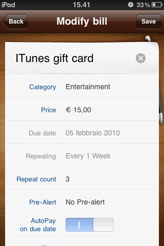 La schermata di una nuova spesa ha molte opzioni che possono essere modificate: il nome, la categoria, il prezzo, la data del pagamento, la ripetitività della spesa, l’opzione per il preavviso tramite notifiche push, l’impostazione per segnare la spesa come effettuata il giorno del pagamento, le note ed infine i due tasti per segnare la nota come “pagata” o “da pagare”.