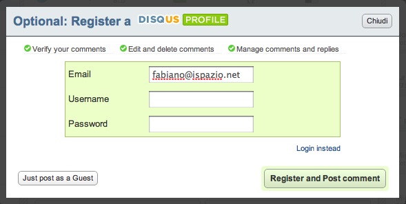 Per commentare sarà sufficiente inserire un Nome, un indirizzo email, ed eventualmente anche l’indirizzo del proprio sito Web. Ovviamente potrete scrivere il messaggio nel box più largo e poi cliccare sul pulsante “Scrivi come Ospite” per inviare il commento. A questo punto si aprirà un pop-up come questo: