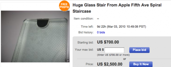Un cliente, infatti, facendo cadere una bottiglia ha rotto un gradino della scala principale dell’Apple Store, ed ha ben deciso di venderselo su eBay. Secondo quanto dice, gli scalini sono progettati da Apple e prodotti da un’azienda tedesca al costo di $10.000 l’uno. Il proprietario dell’asta afferma di non averlo rubato, ma di averlo soltanto preso e caricato in auto aiutato da altri tre ragazzi perchè ovviamente Apple non vuole avere uno scalino rotto nel mezzo del negozio. L’asta che prima partiva da $700, è stata abbassata ai $200. Ora come ora sono state fatte tre offerte e se anche voi volete partecipare vi basterà cliccare qui.