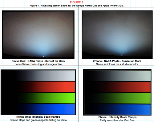 Soneira ha infatti scoperto che lo schermo del dispositivo Google è inferiore a quello dell’iPhone poichè, nonostante la sua maggiore luminosità presenta parecchi “rumori” ed artefatti che lo rendono molto meno accurato.