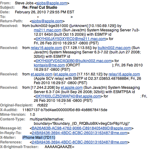 La mail indicava la richiesta, da parte di un utente, di informazioni circa il futuro degli sviluppatori che si occupano di Final Cut Pro, software prodotto da Apple per Mac OS X. Dopo aver appunto esaminato l’header dell’email, l’invio registra un IP interno Apple (17.xxx) ma la cosa più divertente risiede proprio nel fatto che il software usato per la risposta sia identificato come iPhone Mail (7D11), rivelando la versione dell’iPhone OS installata (3.1.2). Non è l’attuale versione del sistema operativo, 3.1.3 – 7E18, e nemmeno il possibile 4.0 Beta che si sperava di vedere.