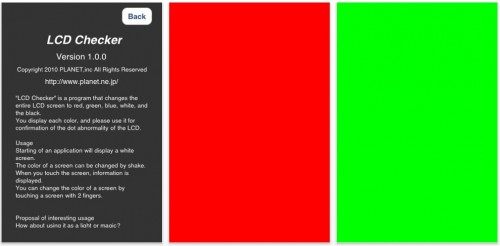 LCD Checker è una semplicissima applicazione disponibile in AppStore che potrà tornarvi utile per testare lo schermo del vostro iPhone o iPod Touch. Il funzionamento è simile a tutte le altre applicazioni dello stesso genere, e colorerà lo schermo in maniera completa, senza lasciare spazi alla StatusBar o altro.