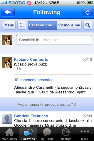 Dalla sezione Following invece, possiamo leggere tutti gli status update dei nostri amici che seguiamo. Di conseguenza possiamo anche rispondere ai loro Buzz e votarli con il tasto “Mi Piace”. La sezione My Post è dedicata alla rilettura di tutti i nostri messaggi ed offre la possibile di scriverne di nuovi. Infine Nearby mostra tutte le persone più vicine su una mappa.