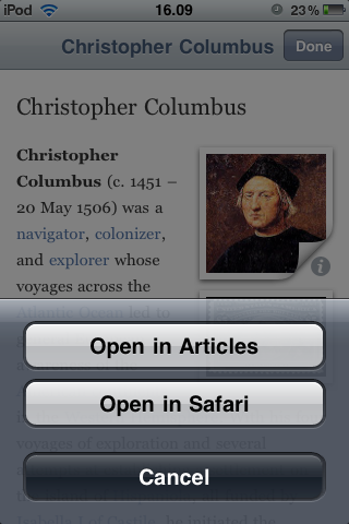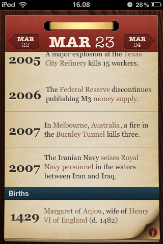 Appena apriamo l’applicazione dopo un caricamento pressoché istantaneo ci troviamo nel giorno odierno e dopo il download dei dati da wikipedia potremmo vedere tutti gli eventi suddivisi per anno. Più in basso, inoltre, c’è la lista di tutte le persone nate in quel giorno. È possibile inoltre aprire i collegamenti alle pagine di Wikipedia direttamente in Safari o attraverso Articles, l’applicazione per Wikipedia della stessa casa produttrice.