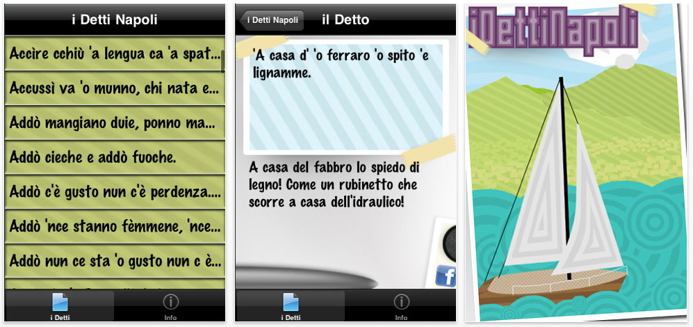 Dal creatore di ricetteNapoli e iMussolini, oggi arriva in AppStore iDettiNapoli, detti, proverbi, modi di dire che hanno fatto la storia della cultura napoletana conosciuta, da secoli, in tutto il mondo. Sono tutti stati raccolti da vecchi libri di cultura napoletana, voci non comuni e non reperibili in rete.