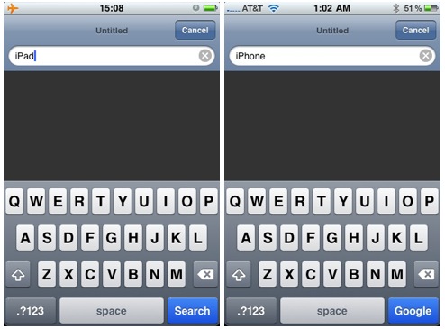 Come potete vedere dalle due immagini, la prima mostra il Firmware 4.0 con la parolina “Search” sul tasto Blu in basso, la seconda invece mostra il Firmware 3.1.3 con la parola “Google”. Tale cambiamento è già incluso anche nel Firmware 3.2 dell’iPad.