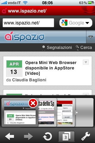 Le altre funzioni di Opera Mini però, risultano veramente interessanti. Possiamo aprire le pagine in altre finestre ed eseguire uno switch veloce cliccando sulla quarta icona della barra inferiore con delle belle animazioni.