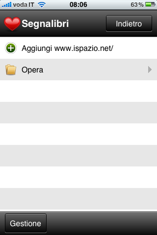 Superate le istruzioni, ci troveremo sulla pagina iniziale formata da 9 quadratini che permettono di accedere velocemente ai vari siti preferiti, che visitiamo molte volte in un giorno. Tra questi troviamo già memorizzati quello di Opera, Qype, La gazzetta dello Sport, il Corriere, Hi5 e Mobile Apps. Potremo aggiungere altri 3 siti negli slot libero oppure modificare quelli esistenti semplicemente tenendo premuto a lungo sulla miniatura e selezionando la voce “Modifica” dal menu.
